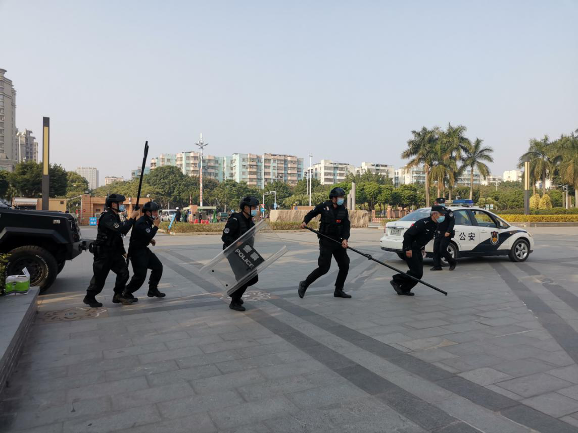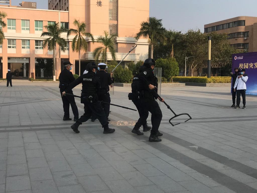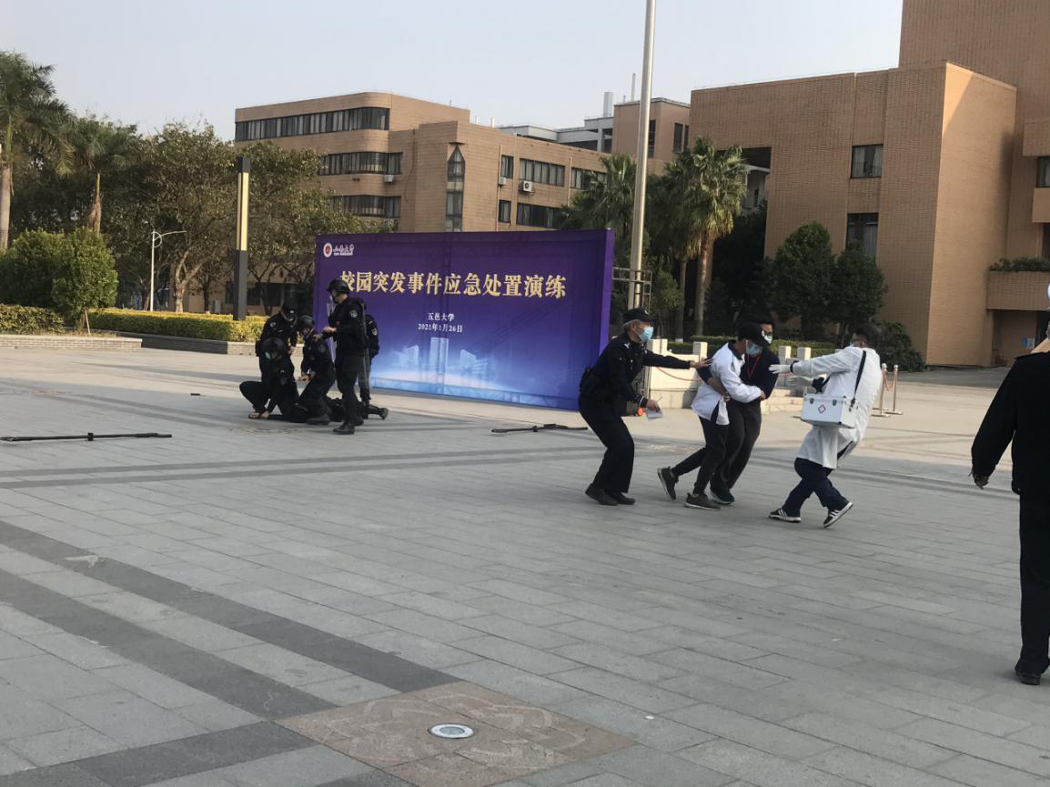 磨礪“安保利劍”守護師生安全。1月26日下午,安保處聯合蓬江區公安分局在菩提廣場開展校園突發事件應急處置演練。