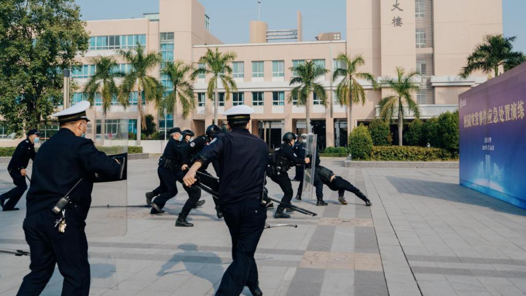 演練分為不明身份人員持刀強闖校園,持刀劫持人質處置兩個科目進行。演練過程中,參演人員按照既定的演練方案有序進行,反應迅速,密切配合,分工協作,應急處置程序得當,處置措施有力,充分展示了我校安保隊伍在面對暴力襲擊突事件面前不躲避、不退縮、臨危不懼、科學處置、勇于斗爭、不怕犧牲的大無畏精神。