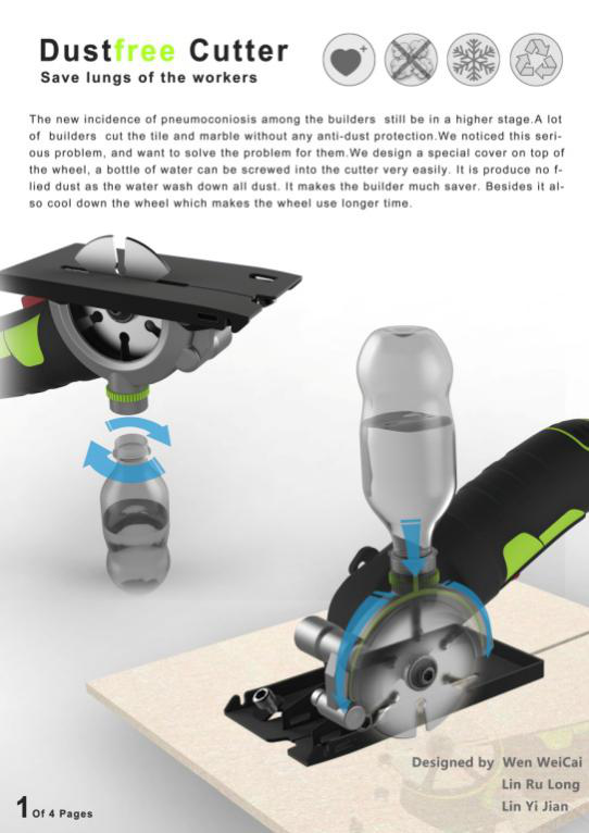 “無(wú)塵切割機(jī)”在小型手持式切割機(jī)頂部擰上一個(gè)裝水的小可樂(lè)瓶,在工人用切割機(jī)打磨大理石及瓷磚時(shí),有效防止塵土飛揚(yáng),保護(hù)了工人的肺部健康。其設(shè)計(jì)靈感源于溫為才老師在家中更換煤氣灶時(shí),看到了工人在切割大理石灶臺(tái)時(shí)產(chǎn)生了大量粉塵而偶然萌生了這個(gè)創(chuàng)意。溫為才老師與工業(yè)設(shè)計(jì)專業(yè)林如龍同學(xué)及產(chǎn)品設(shè)計(jì)專業(yè)林毅堅(jiān)同學(xué)花費(fèi)將近一年的時(shí)間完成了所有的結(jié)構(gòu)設(shè)計(jì),造型設(shè)計(jì)以及樣品制作。