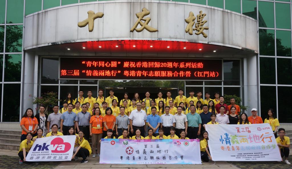 “青年同心圓”慶祝香港回歸20周年系列活動之第三屆“情義兩地行”粵港青年志愿服務合作營(江門站)由廣東省青年聯合會、香港民政事務局主辦,廣東省學生聯合會、廣東省青年志愿者協會、香港志愿者協會、五邑大學承辦,江門市青年聯合會、江門市五邑義工聯合會協辦。自8月20日起,來自香港大學、香港城市大學、香港公開大學、東華學院、Warwick University等學校的28名香港大學生及35名五邑大學學生組成義教隊、義診隊,分別赴五邑中醫院、江海區青少宮、范羅崗社區、伍威權庇護工廠、開平、恩平等地開展為期7天的志愿服務及參觀交流活動。