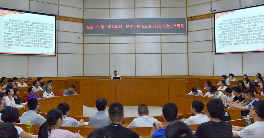 “國歌國旗從來都不只是一面旗幟一首歌,當撤僑進行的時候,唱著國歌舉著國旗通過邊境的時候,它就是我們的力量來源,是我們的精神歸宿,是我們的生命!中國這片土地,也不僅僅是山川、平原、河流,它是我們的根,是我們的魂!”9月27日上午,十友樓二樓國際會議廳座無虛席,黨委書記張焜教授正在講授第一堂思政課——“堅定不移地走中國特色社會主義道路”。電子信息工程、交通工程(軌道交通電氣化)和交通工程(物流管理)專業2016級本科生及學校相關部門負責人、各學院黨總支副書記、全體輔導員、馬克思主義學院黨政班子成員等近200位師生為這段課程視頻所深深感動。