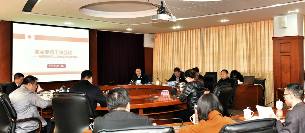 2018年1月16日,校黨委在南主樓七樓小會議室舉行專題工作會議,全體黨委常委作為考官集體考察輔導員崗位應聘者政治素質。通過筆試和面試第一環節的輔導員崗位應聘者接受了這場“特殊的面試”。黨委組織部、學生工作部等部門負責人及各學院專職副書記全程參加。
