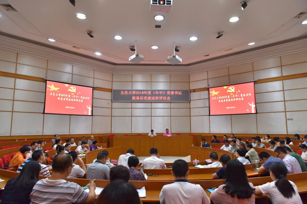 6月27日下午,五邑大學2018年度(年中)黨委書記抓基層黨建工作述職評議會在十友樓二樓國際會議廳舉行,全體校領導、中層干部代表、師生黨員代表、“兩代表一委員”代表參加了會議。