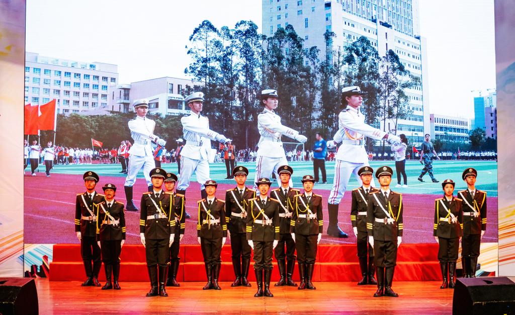 本場晚會以征兵宣傳為主題,以形式多樣的藝術表現形式,號召青年學子響應祖國召喚,攜筆從戎,光榮參軍。晚會上,五邑大學共建共育單位解放軍91760部隊青年官兵帶來的情景劇《西沙英魂》、小品《改名》,形象生動地傳遞了當代青年官兵作為強國興軍的生力軍的責任擔當;作為曾獲廣東省年度“優秀國旗護衛隊”榮譽稱號的學校國旗護衛隊隊員,以一首激昂的詩朗誦《國旗頌》,展現出當代青年大學生立志做國旗捍衛者的堅定信念;學校退伍學生代表帶來大合唱《強軍戰歌》,展現出“參軍報國,建功軍營”的大學生士兵的良好形象……
