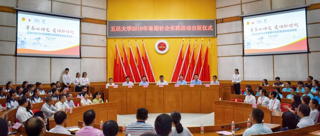 7月13日下午,五邑大學2019年暑期社會實踐活動出征儀式在十友樓二樓國際會議廳舉行。校黨委副書記李靄康,團江門市委書記梁釗俊,臺山市委常委、宣傳部部長羅海華,團臺山市委書記謝永斌,江門市委宣傳部精神文明建設工作科、市義工聯、團臺山市委等相關部門同志及五邑大學相關職能部門負責人、學院(部)黨組織副書記、團總支書記、暑期社會實踐隊伍代表等參加了出征儀式。
