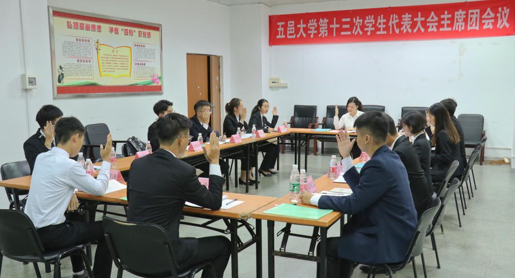 開幕式結束后,學代會代表團、研代會代表團分別進行了3次全體會議、2次主席團會議、2次分代表團會議,聽取并審議通過了五邑大學第十二屆學生會委員會工作報告、五邑大學研究生會2018-2019年度工作報告,以及五邑大學學生會章程修訂案(草案)、五邑大學研究生會章程,并根據大會審議通過的選舉辦法,以無記名投票的方式差額選舉產生五邑大學第十三屆學生會委員會委員19名、五邑大學第一屆研究生會委員會委員11名。其中,學生會主席為朱佳林,副主席為董承國、陳旭燕、林少敏、李筱倩;研究生會主席為龐博維,副主席為王雪奇、譚淑欣。