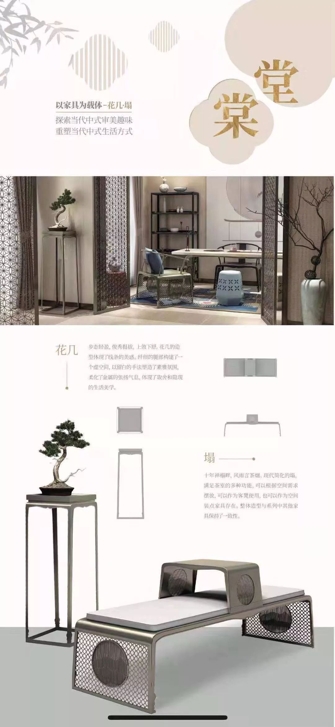 中式家具作品《堂棠》以探索當代中式審美趣味、重塑當代中式生活方式為設計理念,繼承了中國傳統家具的精髓,在材料、工藝、造型及功能上進行了大膽創新。設計以家具為載體,從日常的生活文化方式出發,通過傳統和發揚傳統優秀文化,講好中國故事,向世人展示當代中國文化風貌,傳遞新時期中國文化特質。