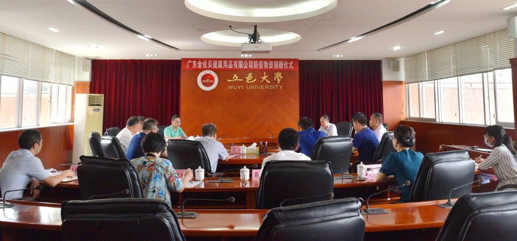 5月6日上午,廣東金優貝健康用品有限公司防疫物資捐贈儀式在五邑大學南主樓七樓小會議室舉行。廣東金優貝健康用品有限公司攜手學校共同抗疫,捐贈一次性醫用口罩10萬只及次氯酸鈉消毒液150瓶。廣東金優貝健康用品有限公司董事長王賢文、總經理助理甘韻怡,五邑大學全體校領導和有關部門負責人參加了捐贈儀式。校黨委副書記、校長張運華主持儀式。