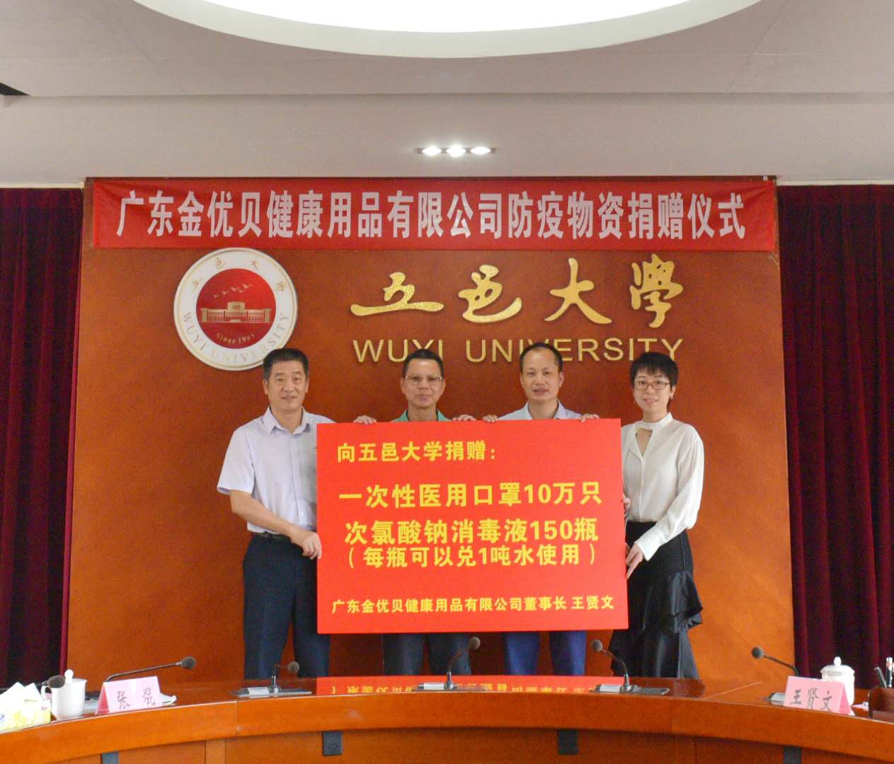 校黨委書記張焜表示,作為五邑大學曾經的一名教師,王賢文董事長不僅積極帶領企業與學校開展科研合作,而且多次表示要支持五邑大學的發展。在當前學校抗疫的關鍵階段,王賢文董事長積極響應國家、省、市疫情防控決策部署,在第一批產品準備下線的前夜即聯系學校,表達了“開學要用到的口罩,由我全部捐獻”的意愿。在政府企業社會共度時艱的時候,廣東金優貝健康用品有限公司還能慷慨解囊支持學校,令師生備受感動。希望公司今后對學校的發展給予更多支持的同時,在科技創新、人才培養方面能有更加密切的合作,形成雙贏的局面。
