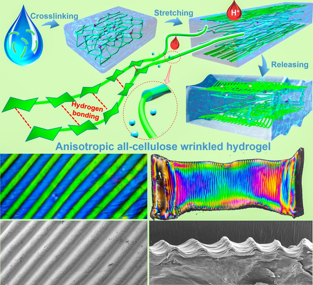 紡織材料與工程學(xué)院的碩士研究生鄒捷(學(xué)號:2111808003,指導(dǎo)老師:葉冬冬博士)利用堿-尿素溶劑體系溶解纖維素,通過預(yù)交聯(lián)纖維素溶液,制得具有彈性的纖維素堿凝膠。通過預(yù)牽伸該堿凝膠至特定牽伸比,快速浸漬于稀酸溶液(4-20 s),驅(qū)動纖維素纖維素凝膠內(nèi)外層模量差,誘導(dǎo)凝膠表面重構(gòu)現(xiàn)象導(dǎo)致凝膠體系產(chǎn)生力學(xué)失穩(wěn),因此,撤去外力后,內(nèi)層彈性堿凝膠回復(fù),外層剛性雙交聯(lián)纖維素凝膠褶皺化,導(dǎo)致產(chǎn)生一種具有周期性平行排列結(jié)構(gòu)的褶皺纖維素水凝膠。可編程的褶皺結(jié)構(gòu)誘導(dǎo)細胞取向性生長,該材料是一種創(chuàng)新性生物基新材料(Advanced Materials, 2019, 31, 1904762)。