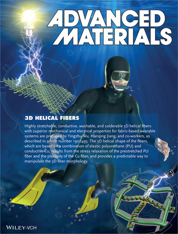 紡織材料與工程學(xué)院的碩士研究生楊子航(學(xué)號:2111808006,指導(dǎo)老師:巫瑩柱副教授,姜漢卿教授),利用微米級超細銅絲作為高導(dǎo)電組分、聚氨酯超細單絲作為彈性組分、氰基丙烯酸酯作為膠粘劑和絕緣層,預(yù)拉伸聚氨酯單絲后,用氰基丙烯酸酯膠粘劑將其與超細銅絲并列復(fù)合,4秒后,膠粘劑快速固化,卸去聚氨酯單絲的拉伸應(yīng)力,即可制備出高彈性,可水洗,可任意焊接的高導(dǎo)電三維螺旋纖維新材料。該方法具備規(guī)模化生產(chǎn)潛力。可通過調(diào)控聚氨酯纖維的預(yù)應(yīng)變對最終形成的3D螺旋結(jié)構(gòu)進行定制(直徑D和螺旋角α),COMSOL Multiphysics軟件的模擬結(jié)果表明,預(yù)應(yīng)變從100%增加到400%時,螺旋D的直徑從1.4 mm減小到0.6 mm;超細銅絲的塑性應(yīng)變也影響螺旋角α變化,以上理論結(jié)果與實驗結(jié)果吻合,為新型彈性功能纖維材料提供理論依據(jù)。該新型彈性導(dǎo)電纖維材料將使柔性可穿戴電子器件在醫(yī)療、運動、潛水、軍事等領(lǐng)域得到廣泛應(yīng)用(Advanced Materials, 2020, 32, 1907495,該研究成果被選為卷首頁圖)。