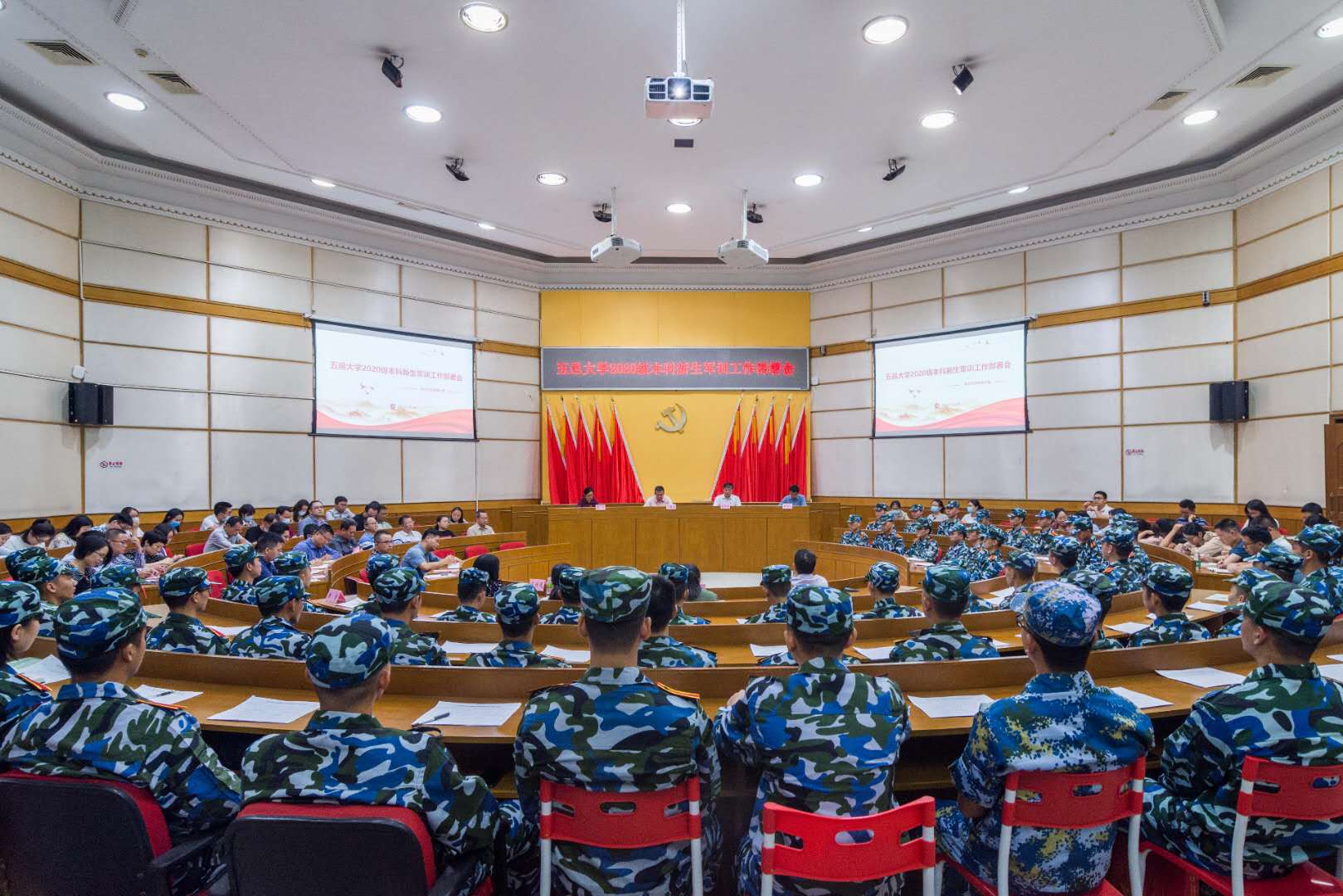 10月9日下午,五邑大學2020級本科新生軍訓工作部署會在十友樓二樓國際會議廳召開。出席會議的學校領導有校黨委副書記李靄康,校黨委常委、副校長陳廷根。參加會議的有新生軍訓工作領導小組成員、軍訓團辦公室成員、各學院(部)黨組織書記、副書記、輔導員、新生班導師代表、全體軍訓教官。會議由校武裝部部長薛超良主持。