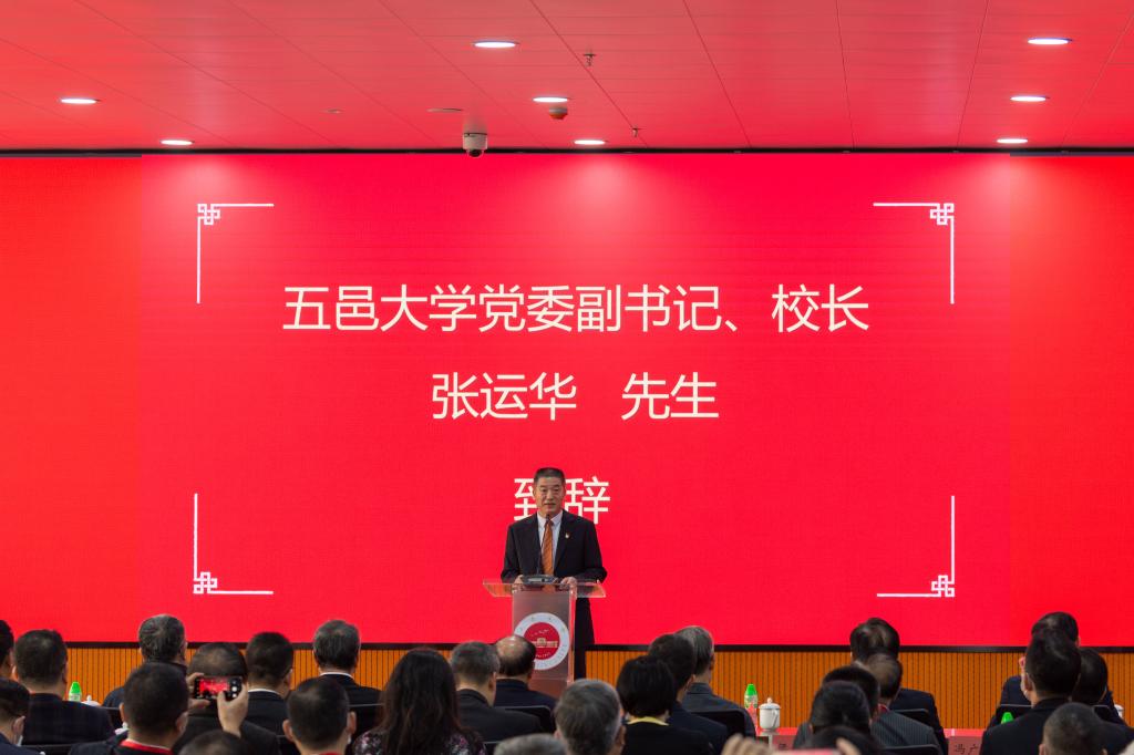 五邑大學黨委副書記、校長張運華代表全校師生向出席慶祝大會的各位領導和嘉賓表示熱烈歡迎,向支持母校發展、為母校贏得社會聲譽的廣大校友致以親切問候,向所有邑大開拓者和見證者致以崇高敬意,向長期關心和支持五邑大學建設發展的海外僑胞、港澳臺同胞、社會各界人士致以衷心感謝。