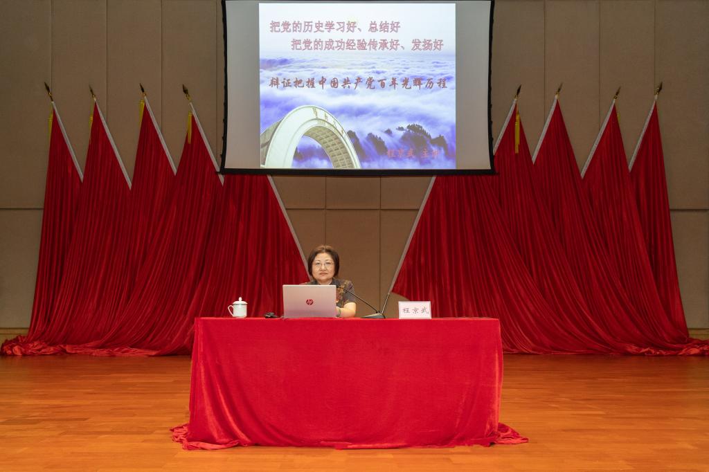 程京武從黨的發(fā)展史看黨的百年風(fēng)華、黨的百年偉大歷程所蘊含的智慧力量及經(jīng)受新時代歷史和人民的選擇等三方面展開講授。她從歷史視角深刻闡述中國共產(chǎn)黨的誕生及偉大貢獻,她指出,近代中國面臨兩大歷史任務(wù),一是求得民族獨立和人民解放,二是實現(xiàn)國家繁榮富強和人民共同富裕,為此無數(shù)仁人志士進行了可歌可泣的斗爭,進行了各式各樣的嘗試,但都沒有改變舊中國的社會性質(zhì)和中國人民的悲慘命運,經(jīng)歷過屢次的失敗,歷史呼喚新的階級來領(lǐng)導(dǎo),中國共產(chǎn)黨應(yīng)運而生。她詳細闡述了中國共產(chǎn)黨成立后,歷經(jīng)百年,完成和推進的四件大事,一是開天辟地,中國共產(chǎn)黨在新民主主義革命時期完成救國大業(yè),二是改天換地,在社會主義革命和建設(shè)時期完成興國大業(yè),三是翻天覆地,在改革開放和社會主義現(xiàn)代化建設(shè)新時期推進富國大業(yè),四是驚天動地,在新時代推進社會主義現(xiàn)代化建設(shè)并將在本世紀(jì)中葉實現(xiàn)強國大業(yè)。