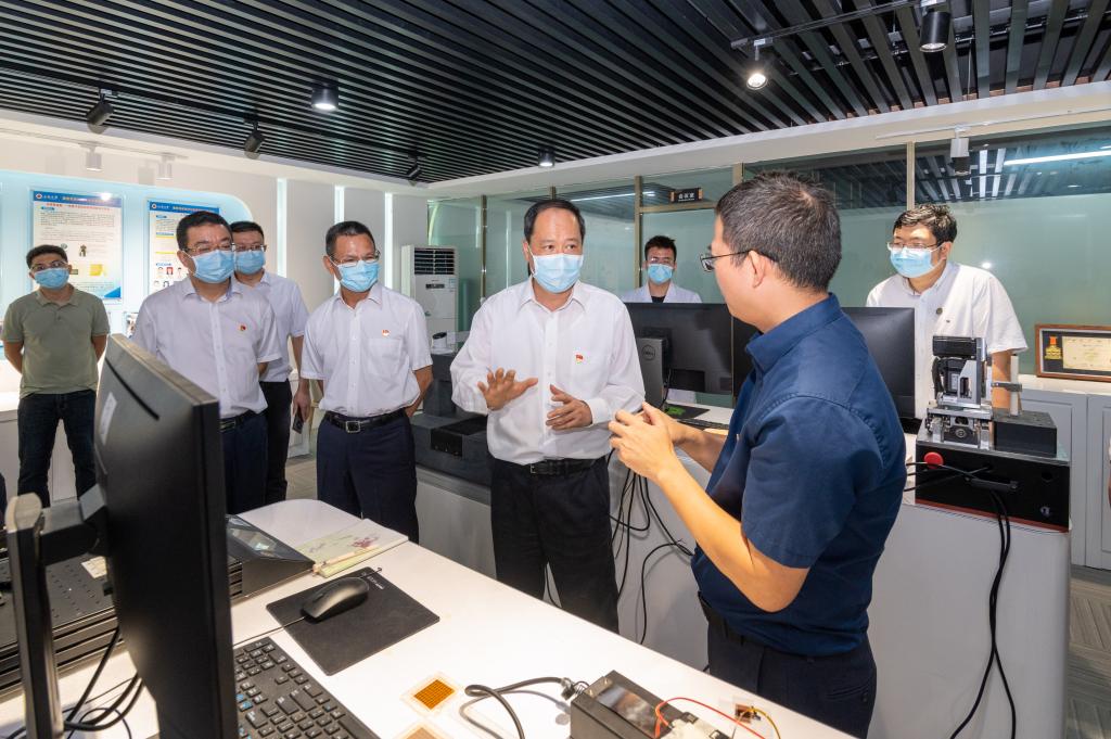 在柔性傳感材料與器件研究開發(fā)中心,陳岸明一行聽取了中心負責人羅堅義教授的匯報。羅堅義教授重點介紹了一種柔性的觸覺傳感器等代表性成果,以及圍繞醫(yī)學等領域開展合作的情況。陳岸明對中心工作表示高度認可和大力支持。他指出,成果的應用領域廣泛,接下來要進一步打開思路,找準關鍵領域,著力推進成果的產(chǎn)業(yè)化。