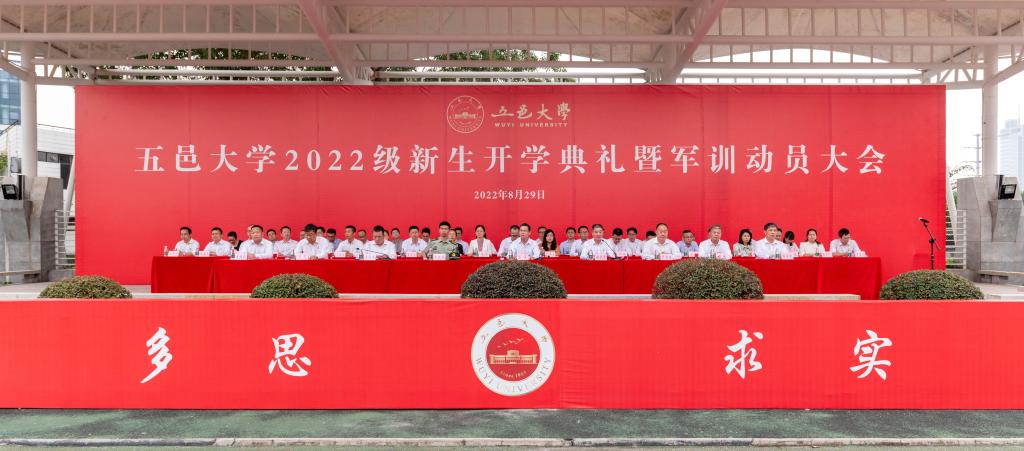 8月29日上午,五邑大學2022級新生開學典禮暨軍訓動員大會在北區田徑運動場舉行。學校黨委書記張焜、校長張運華等全體校領導,江門軍分區動員處上校處長劉桂強,學校有關職能部門負責人和學校軍訓工作領導小組全體成員,各學院(部)黨政主要負責同志、副書記、輔導員,全體軍訓教官及2022級全體新生等出席了本次典禮。典禮由校黨委書記張焜主持。