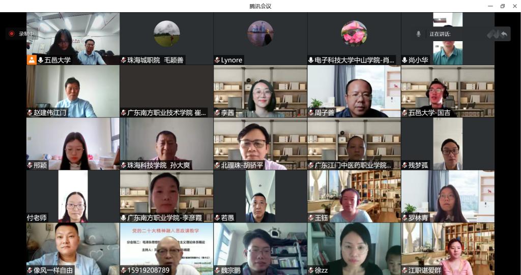 為積極推進(jìn)黨的二十大精神融入思政課程,交流教學(xué)經(jīng)驗(yàn),11月13日上午,廣東省高校思政課區(qū)域協(xié)同創(chuàng)新中心(珠中江)舉辦了“黨的二十大精神融入思政課”教學(xué)研討會。本次教學(xué)研討會由五邑大學(xué)馬克思主義學(xué)院承辦,以線上會議形式舉行,珠中江三市15所高校馬克思主義學(xué)院(思政部)共80余名教師參加本次研討活動(dòng)。