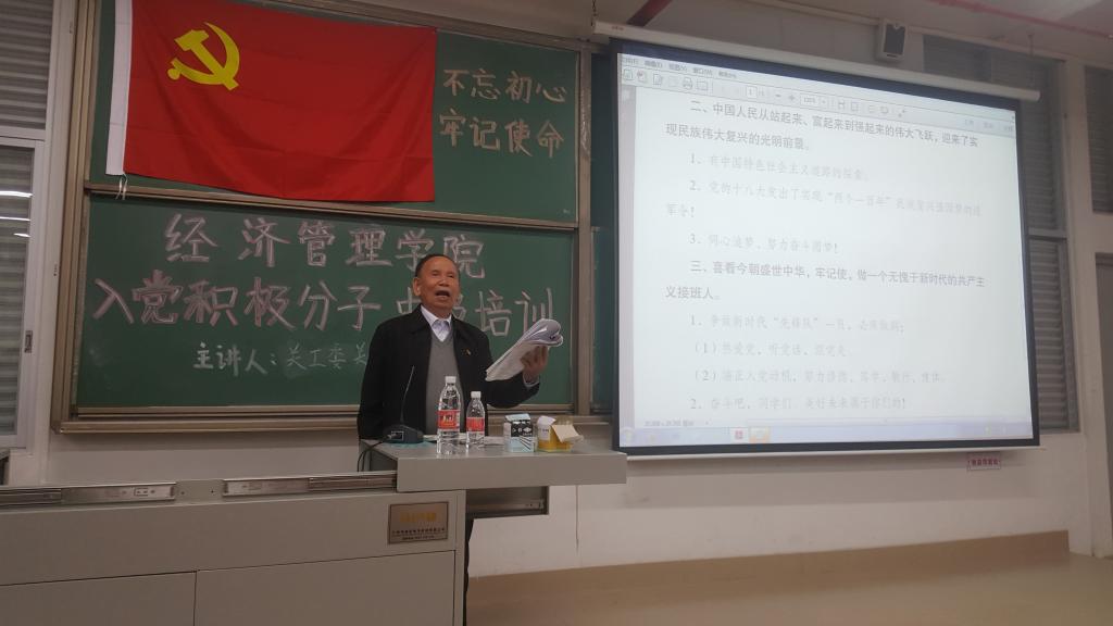 12月3日下午,經濟管理學院黨總支于北主樓602課室組織開展了“不忘初心、牢記使命,爭做新時代有擔當的大學生”為主題的中級黨課培訓,學院黨總支邀請了校關工委老黨員關福漢同志授課,授課對象為全體入黨積極分子。
