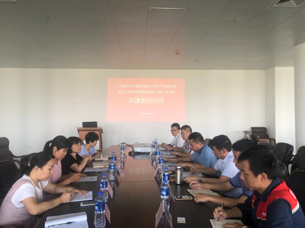 為進一步發揮黨建引領作用,提高基層黨建工作水平,形成以黨建促共建共同發展的良好局面,5月14日下午,廣東省天然氣管網有限公司生產運營黨支部與我院教工第六黨支部共建友好黨支部簽約儀式在策文商學院大樓402會議室舉行。廣東省天然氣管網有限公司黨委副書記、紀委書記孫力興、運營部總經理譚春波、黨群工作部部長徐玉柱,五邑大學經濟管理學院黨總支副書記謝輝玲、副書記吳小霞、教工第六黨支部書記賴英華以及雙方黨員代表等11人參加了簽約儀式。