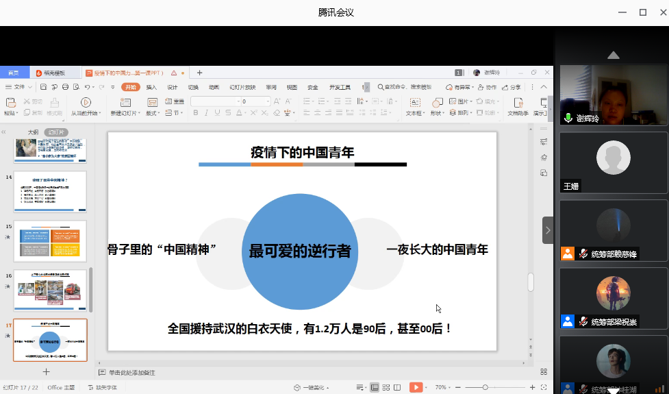 課上,謝輝玲書記通過視頻與圖片分享、案例解析等多種形式,通過講述黨中央的集中統一領導和高效決策,堅持全國一盤棋、集中力量辦大事,全國人民的顧全大局和積極防疫,以及科技抗疫取得的巨大成就,來詳細為學生們分析了中國力量之制度優勢;通過詳細解讀《中國抗疫圖鑒》以及“致敬醫者、致敬勇者”視頻,來分析眾志成城、自強不息、以人為本的中國精神;最后謝輝玲書記還講述了疫情下的中國青年奮勇擔當的各種突出表現,為在座黨員同學樹立榜樣標桿,并以《習近平總書記給北京大學援鄂醫療隊全體“90后”黨員的回信》結束本場講課,號召廣大黨員學生堅定理想信念,站穩人民立場,練就過硬本領,投身強國偉業!(文/圖 經濟管理學院)