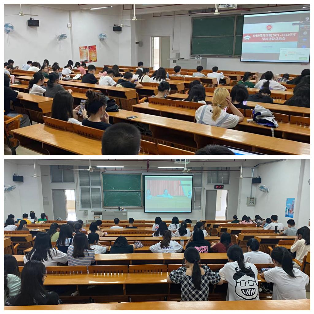 為貫徹落實黨的教育方針,樹立我院優良學風典型、總結學院學風建設經驗、創造班風正、學風濃的良好學習環境,6月19日下午,經濟管理學院舉行了2021-2022學年學風建設總結會,會議主會場在十友樓二樓國際會議廳,分會場分設在北主樓9個教室。學院黨委書記謝輝玲、副書記王婷、副院長吳東武、各年級輔導員、部分班導師和全體非畢業生參與了會議。會議由輔導員許容榕主持。