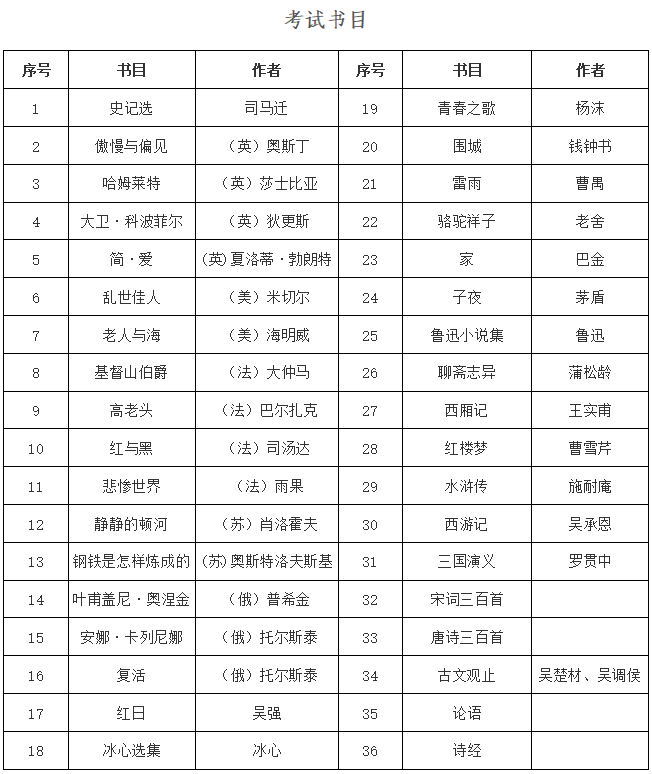 4.考試書目:考試書目見附件,本學期最多選考5本書。讀書活動學分認定:讀一本書并考試通過計0.2學分,在校期間每個學生通過讀書活動最多取得5次學分,超過部分不計學分。