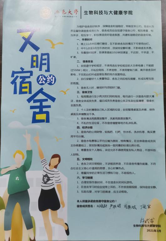 會上,鄒武龍從活動背景,實施過程,目標(biāo)效果等三方面解讀了“創(chuàng)先鋒宿舍”實施方案。優(yōu)秀宿舍代表23-108,27-608分別從宿舍成員、宿舍風(fēng)貌、宿舍學(xué)風(fēng)、宿舍學(xué)風(fēng)等方面進行了宿舍經(jīng)驗分享和交流。隨后,鄒武龍老師代表學(xué)院與各年級宿舍長代表簽訂宿舍文明公約。侯桂根希望同學(xué)們將宿舍當(dāng)成自己的家,以“創(chuàng)先鋒宿舍”為契機,維護宿舍安全,養(yǎng)成良好的生活作息,共同營造良好的宿舍文化環(huán)境。許皓指出學(xué)院以“創(chuàng)先鋒宿舍”為切入點,探索、創(chuàng)新宿舍管理模式,努力為學(xué)生建設(shè)一個文明、和諧的宿舍環(huán)境,希望同學(xué)們以黨史學(xué)習(xí)教育為契機,學(xué)史崇德,學(xué)史力行,奮發(fā)有為,爭創(chuàng)先鋒,以優(yōu)異成績向建黨100周年獻禮。