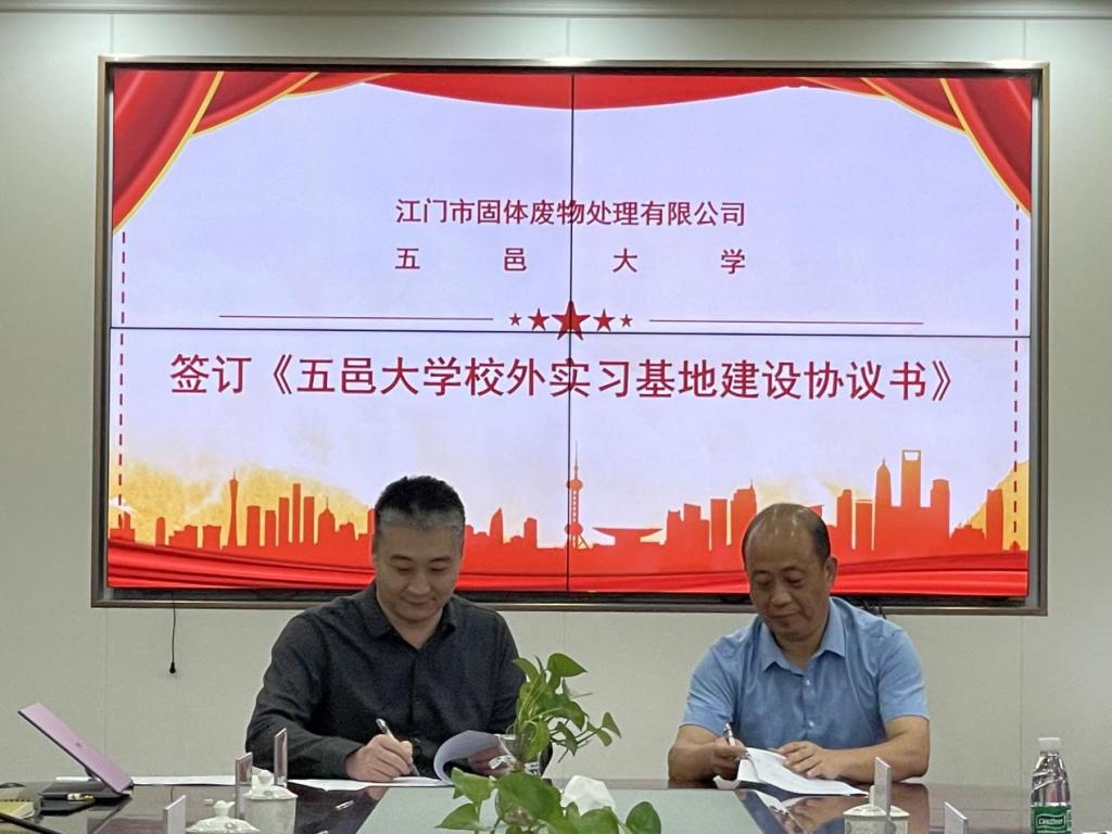隨后,雙方結對共建黨支部書記李冰與劉金華分別代表黨建共建單位簽署黨建結對共建協議書,學院副院長徐學濤與江門市固體廢物處理有限公司副總經理張明代表雙方單位簽署校外實習基地建設協議書,并舉行產學研合作教育基地揭牌儀式。