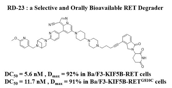 RET (rearranged during transfection)基因是一種原癌基因,該基因編碼一種位于細胞膜上的受體酪氨酸激酶(RTK)。RET基因的融合和突變會導致多種類型的癌癥。本文基于PROTAC技術,報道了一類具有良好口服生物利用度的RET選擇性降解劑RD-23。RD-23對多種RET突變體均有效,是首個能夠通過口服給藥方式實現顯著抗腫瘤活性的RET蛋白降解劑。