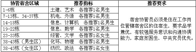 為加強學生宿舍服務與管理,促進學生自我管理、自我教育和自我發展,營造卓越的學生宿舍居住環境和人文環境,學生處每年聘用若干名品學兼優、樂于助人、善于溝通的學生成為“學生宿舍協管員”。宿舍協管員以全心全意為住宿生服務為宗旨,在學生處宿舍管理科的領導下,協調水電科、物業公司、校學生自律委員會、校學生會等相關單位和部門,開展各項宿舍相關工作。現將《學生宿舍協管員管理辦法(試行)》(見附件)下發院(系)征求意見,同時請各院(系)配合做好宿舍協管員的招聘工作,具體要求通知如下: