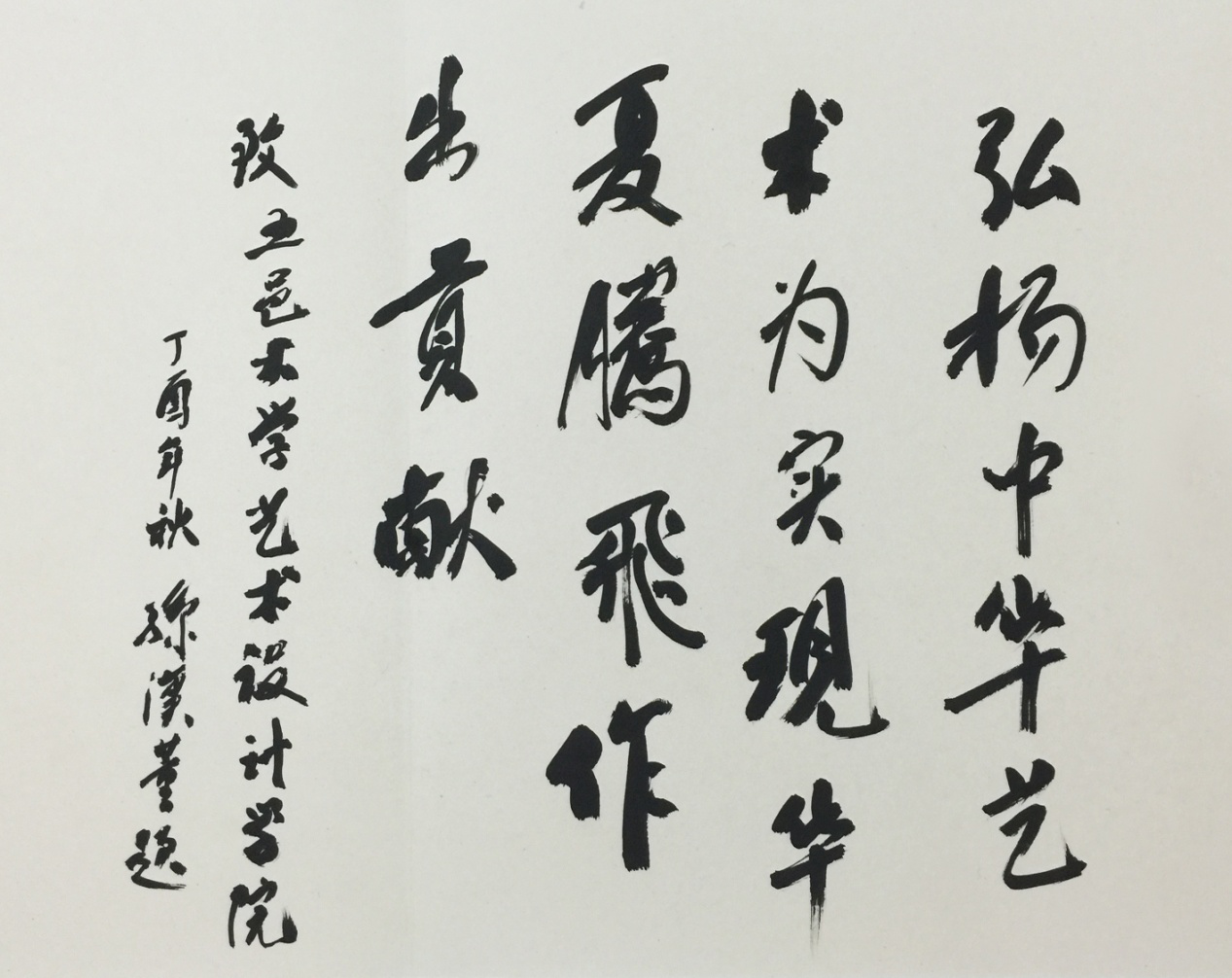 2017年10月16日上午,中國科學(xué)院孫漢董院士等一行在校黨委書記張焜和校長張運華的陪同下蒞臨藝術(shù)設(shè)計學(xué)院江門市藝術(shù)設(shè)計館參觀。孫院士一行參觀了設(shè)計成果展示,并仔細(xì)了解設(shè)計學(xué)科與地方產(chǎn)業(yè)的產(chǎn)學(xué)合作情況,對學(xué)院學(xué)科建設(shè)、教學(xué)科研、近年服務(wù)地方文化產(chǎn)業(yè)和行業(yè)所做的設(shè)計工作給予了肯定。參觀后,孫漢董院士給藝術(shù)設(shè)計學(xué)院題詞留念。題詞留言內(nèi)容為:弘揚中華藝術(shù)為實現(xiàn)華夏騰飛作出貢獻(xiàn)。