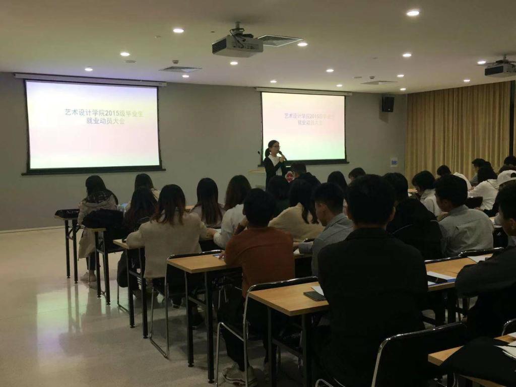 為更好地引導畢業生明確就業方向,切實提高藝術學院畢業生就業水平,11月22日,藝術設計學院于學生綜合服務中心召開2015級畢業生就業動員大會,出席本次會議的有黨總支副書記楊燕,輔導員王甜子、羅文敏以及2015級全體畢業生。