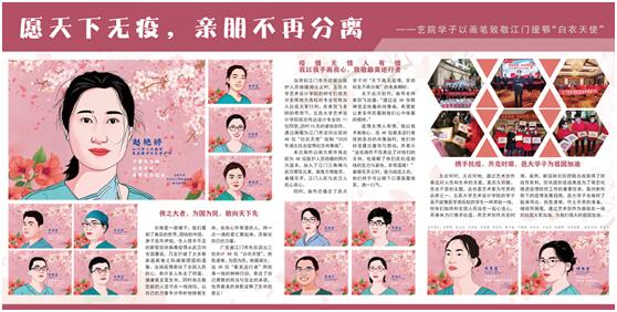 發(fā)揮專業(yè)優(yōu)勢(shì),以“藝”抗“疫”。學(xué)院號(hào)召藝術(shù)學(xué)子充分發(fā)揮專業(yè)優(yōu)勢(shì),以實(shí)際行動(dòng)助力抗擊新冠肺炎疫情工作。在黃驍帶領(lǐng)下,師生團(tuán)隊(duì)與企業(yè)聯(lián)合設(shè)計(jì)的“醫(yī)療凈化隔離病床”被廣州市黃埔區(qū)工業(yè)和信息化局列為當(dāng)前防疫急需物資。在單賀飛老師帶領(lǐng)下,學(xué)生們?yōu)轳Y援湖北的48位醫(yī)護(hù)人員制作“2020年湖北抗擊疫情”紀(jì)念肖像畫,并于4月3日江門市委市政府舉行的“援鄂醫(yī)療隊(duì)休整結(jié)束歡送活動(dòng)”中,向每一位醫(yī)護(hù)人員贈(zèng)送了溫情的禮物。視覺傳達(dá)設(shè)計(jì)專業(yè)的劉沁沁設(shè)計(jì)的“天醫(yī)拱照、中國(guó)加油”作品,被團(tuán)市委采納,印在江門團(tuán)市委送給武漢的物資上。產(chǎn)品設(shè)計(jì)專業(yè)的謝芊蕓用手中的畫筆贊頌抗擊疫情的白衣天使,致敬英雄。她所創(chuàng)作的《活動(dòng)中暑暈倒——書畫致敬》作品,被省學(xué)聯(lián)采納并進(jìn)行推送。