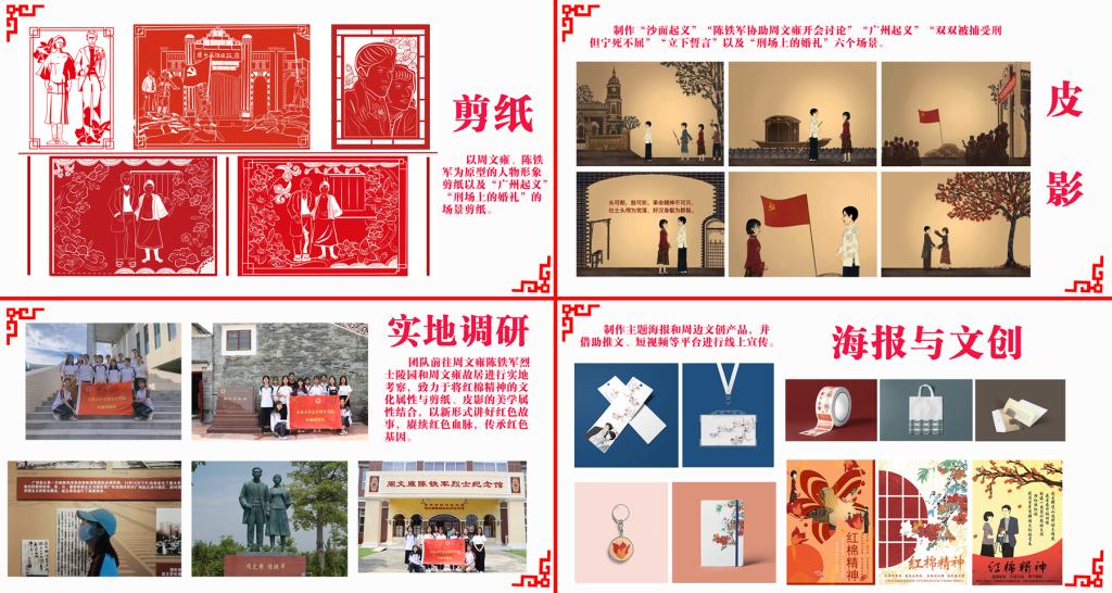 紅棉剪影隊以周文雍陳鐵軍革命故事為基底,通過實地考察與線上調研,推出以周文雍、陳鐵軍為人物原型的剪紙、皮影、主題海報、周邊文創產品等,并借助推文、短視頻等平臺進行線上宣傳。團隊充分挖掘本土紅色資源和深入學習民間手工藝術,將紅棉精神的文化屬性與剪紙、皮影的美學屬性結合,展現中國傳統文化的魅力,以新形式講好紅色故事,賡續紅色血脈,傳承紅色基因。