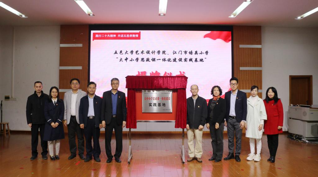 為認真學習貫徹落實黨的二十大精神,統籌推進大中小學思想政治教育一體化建設工程,推動思政課內涵式發展,藝術設計學院聯合黨建共建單位江門市培英小學,共同建設“大中小學思政課一體化建設實踐基地”,以黨建引領,在扎實推動思政課高質量發展中落實立德樹人根本任務。12月1日,雙方在培英小學舉行了共建實踐基地簽約儀式暨揭牌儀式。
