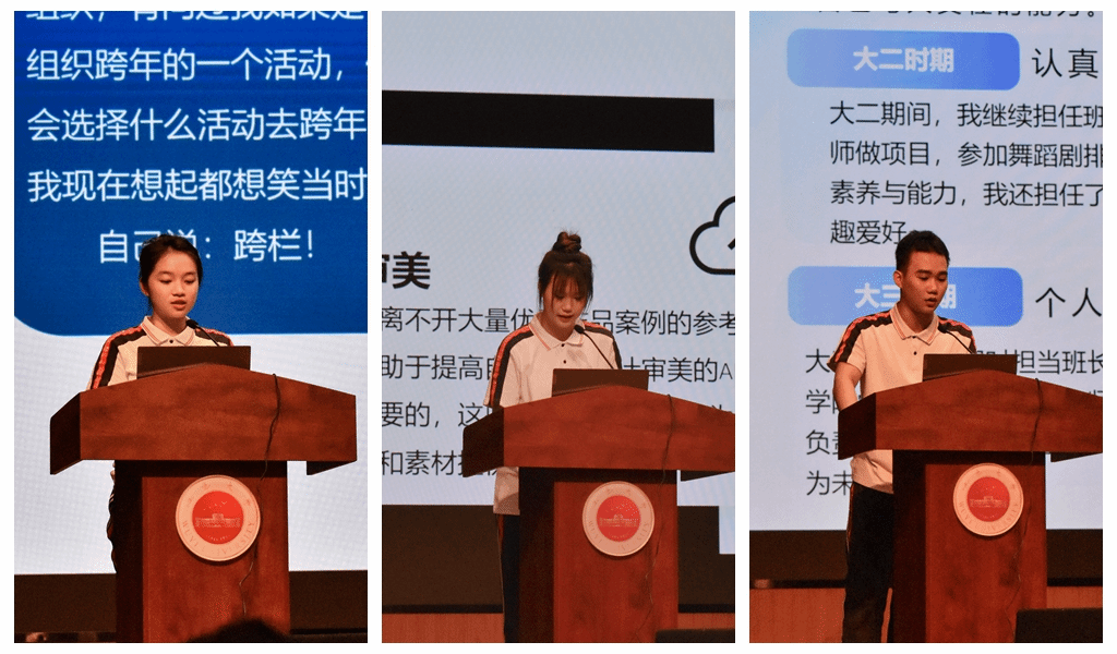 學生代表2020級工業設計專業吳梓瑄、2021級服裝與服飾設計專業羅若嵐、2021級舞蹈學專業盤金權結合個人實際,分享了專業學習、學科競賽、實踐鍛煉的心得體會。