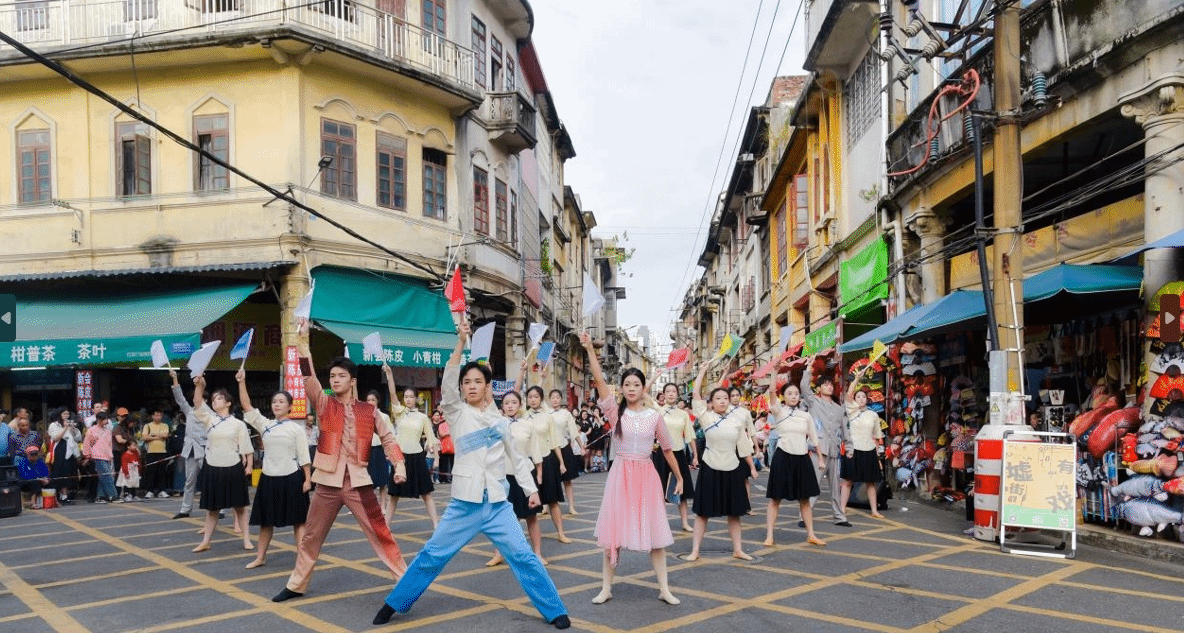 11月9日,“江門三點三精彩之旅·墟街有戲”上演舞蹈“快閃”,藝術與設計學院教師張友元、戴佳榮等,帶領舞蹈系學生在長堤風貌街“黃格子”處,表演了一系列高質量的舞蹈。