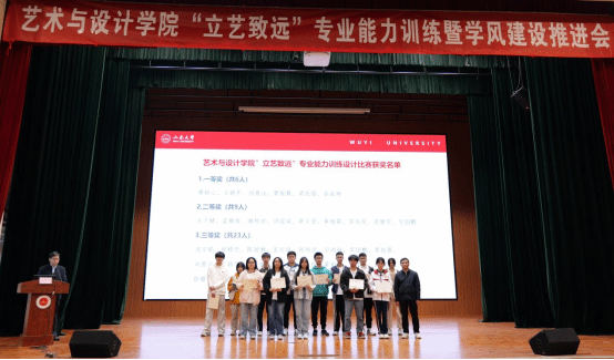 會上,對“立藝致遠”專業能力訓練設計比賽獲獎學生進行表彰,孫振老師宣讀表彰決定,學院黨委書記楊玉豪頒獎,激勵全體學生以優秀為榜樣,勇攀高峰,不斷提升專業能力和綜合素質。
