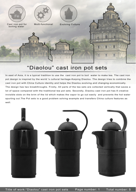 碉樓生鐵壺是近十年來唯一獲得美國工業(yè)設(shè)計卓越獎(IDEA)碉樓生鐵壺設(shè)計靈感源于五邑地區(qū)世界文化遺產(chǎn)開平碉樓,將中國建筑美學(xué)法則貫穿于生鐵壺的各個細(xì)節(jié),塑造出中國現(xiàn)代設(shè)計全新的視覺識別特征。創(chuàng)新的泄氣方式解決了傳統(tǒng)生鐵壺?zé)崴畤姙R問題,垂直收納結(jié)構(gòu)不僅節(jié)省放置空間,也賦予生鐵壺這一傳統(tǒng)產(chǎn)品更為時尚化的國際元素。這是一款原創(chuàng)的中國生鐵壺,打破了日本生鐵壺對中國市場壟斷格局。