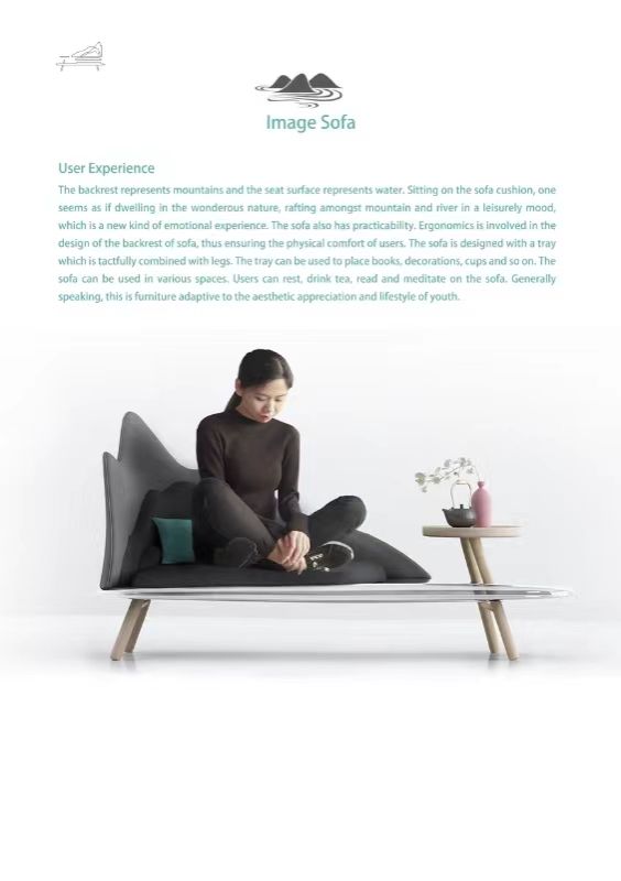 作品“Image Sofa”獲得了專業類“Furniture, Decorative Items and Homeware Design”組別的金獎。該作品由陳振益副教授和張超教授帶領的師生設計團隊與森源家具有限公司共同開發完成。其中,五邑大學的設計團隊負責創意設計,森源家具負責工藝制造。該作品的設計靈感來源于中國山水畫和傳統士大夫的生活方式,以現代和國際化的設計語言再現東方的山水精神,探索家具設計在傳統和自然基礎上的再創新。作品的沙發靠背用不同色調的布料層層包裹,形成山的層次感,代表男性的陽剛;座面使用透明亞克力材料,代表女性的輕柔。山倒映水中,水環繞山。使用者坐于沙發坐墊上,仿佛泛舟于山水之間。而沙發的腿部與托盤則巧妙地結合在一起,兼顧了美觀、實用性和人機工程學。與此同時,該設計探索了多種材料的結合,在材料和制造工藝上也有較大的創新。